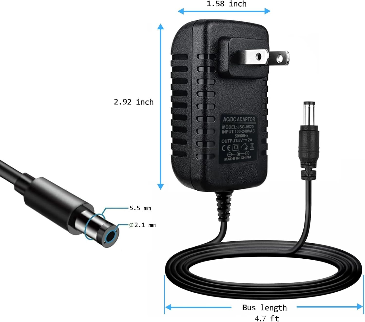 【Cable Length】ac adapter power cord 150 cm / 5 feet, alleviating concerns of cord length limitations. Polarity: Center positive (+). IMPORTANT: Verify that your device operates within or below a 5V 2A output range.